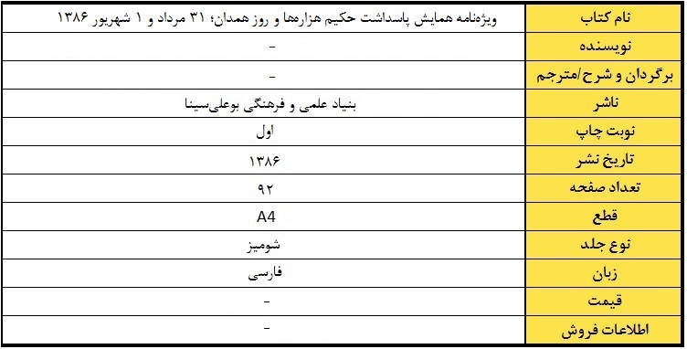 ویژهنامه همایش پاسداشت حکیم هزاره و روز همدان - شهریور ۱۳۸۳ این اثر ویژهنامه همایش پاسداشت حکیم هزارهها و روز همدان است که ۳۱ مرداد تا ۱ شهریور ۱۳۸۳ در همدان برگزار شد.