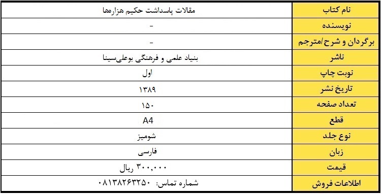 مقالات همایش پاسداشت حکیم هزارهها این اثر مجموعه مقالات همایش پاسداشت حکیم هزارهها است که در سال ۱۳۸۶ برگزار شد و در سال ۱۳۸۹ به مناسبت نخستین دوره اهدای جایزه بینالمللی بنیاد علمی و فرهنگی بوعلیسینا (جشنواره حکمت سینوی، آبان ۱۳۸۸) به چاپ رسید.